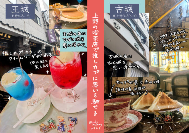 カプの話は置いておいて流石昔からの有名な人気店。純喫茶ならではのメニューも美味しいしどちらも内装も豪華。古城はステンドグラスもあって城の雰囲気がある…🏰