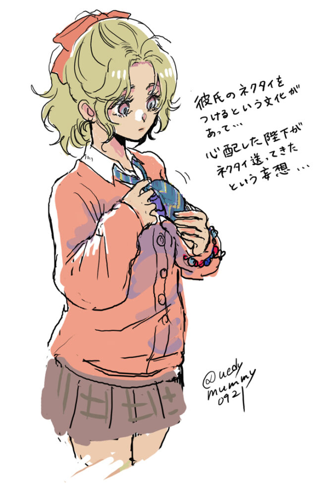 本来リボンの制服なんだけど彼氏がいる女子は彼氏のネクタイをつけるという高校が自分の居住エリアにあったのを思い出しまして…ディシデュエ、こっちの世界に入り込む為に服を用意してる設定みたいなので陛下が魔除け的な意味でネクタイを送ってきた的な…そして自分に対してネクタイを結ぶのに苦戦してるティナ的な……